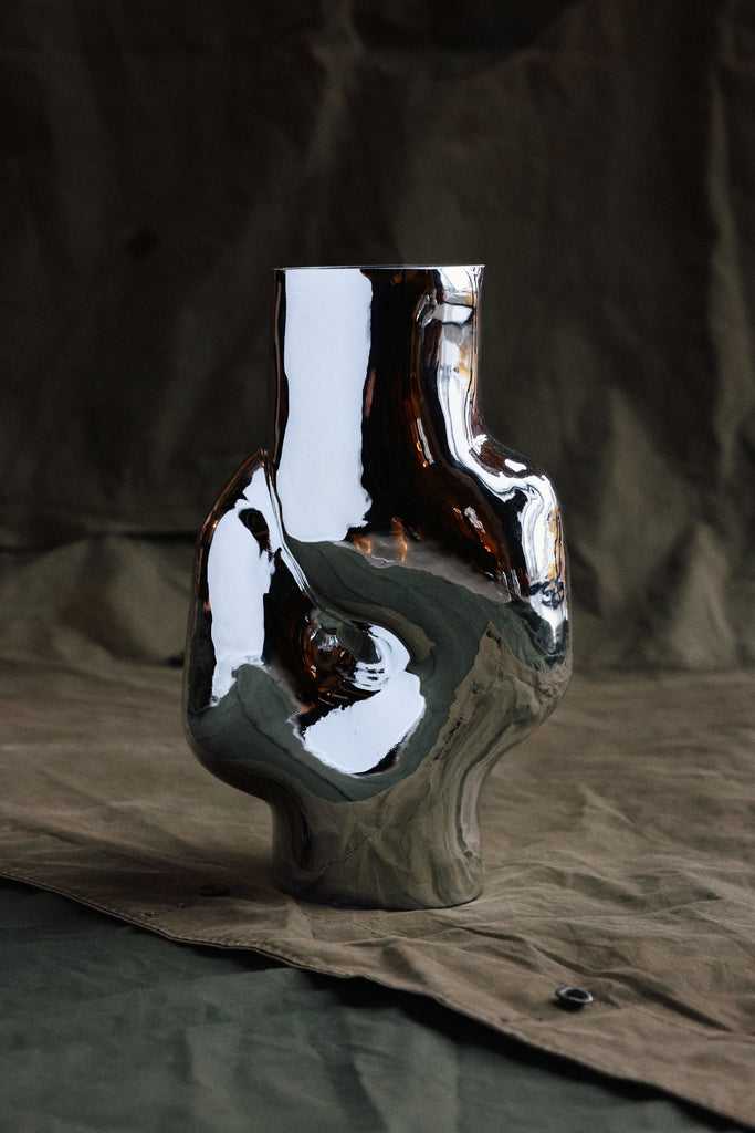 Make a bold statement with this chrome glass vase. Its reflective surface and organic shape blend nature’s fluidity with a contemporary edge. Use it as a striking center piece or pair it with other pieces for a layered display.