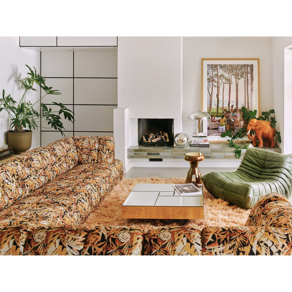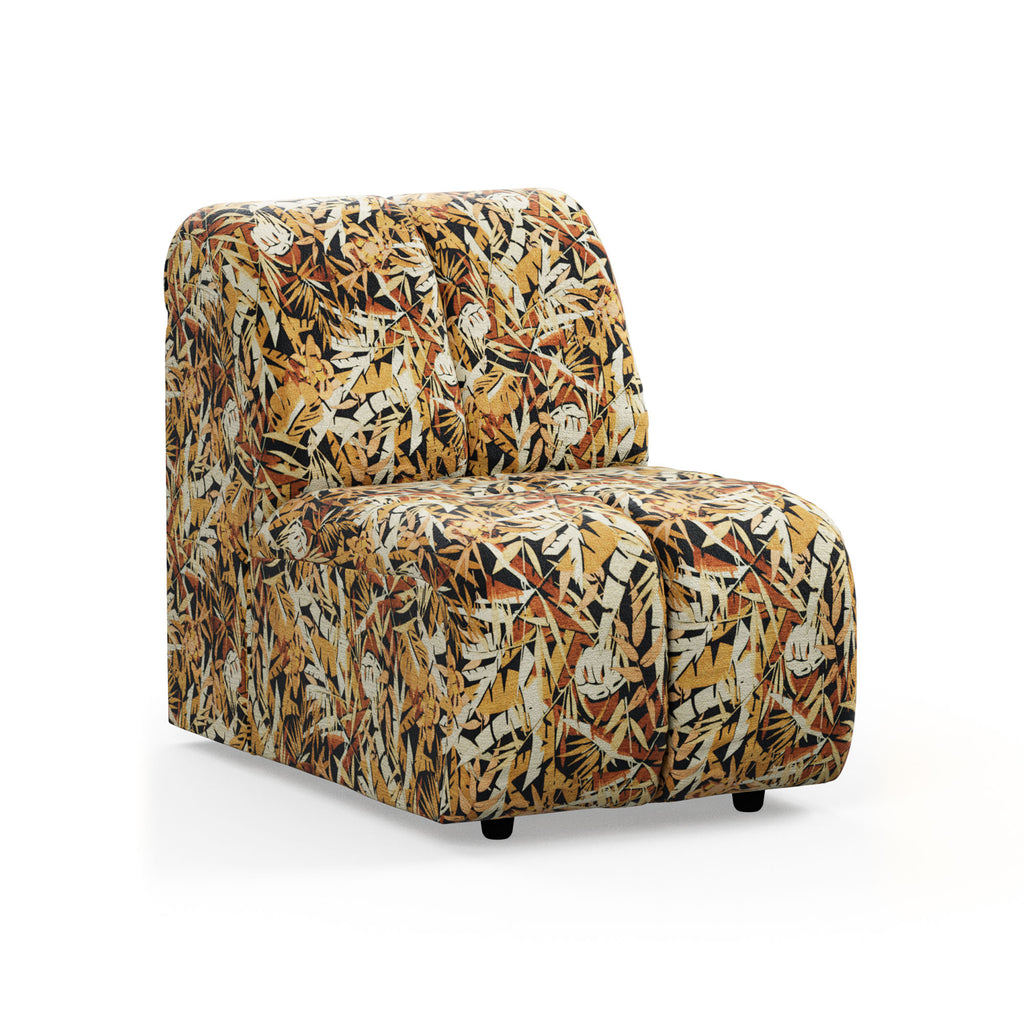 Inspired by the desire to lounge around from time to time, we have created a couch that is both multi-functional and contemporary. You're in charge and you can create the couch you want with our nine Wave couch elements. It has a slightly more active seat and can be combined with an inviting divan element. The overall shape of the couch can be traced back to Hollywood in the early 1970s and, thanks to its round curves, it will turn your living room into an inviting place to gather and relax. Get ready, because the couch comes upholstered in a special fabric that has only been designed for the Wave couch. The jungle print is for those who have a craving for richness and extravagance in their lives.